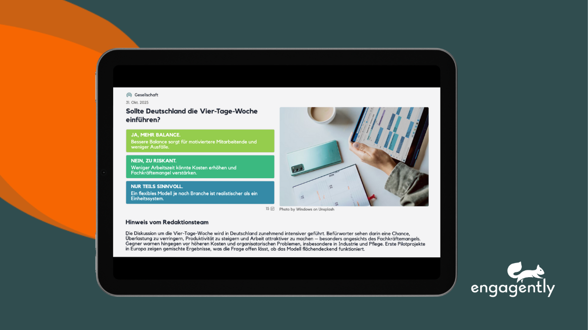 Publisher gestalten den Rahmen aktiv: Von der Hauptfrage über Erklärungstexte bis hin zu redaktionellen Hinweisen lässt sich jede Debatte individuell anpassen. Farbcodierte Optionen und visuelle Elemente sorgen für Übersichtlichkeit. Die Moderation erfolgt direkt in conversario – für einen sicheren, respektvollen Austausch.