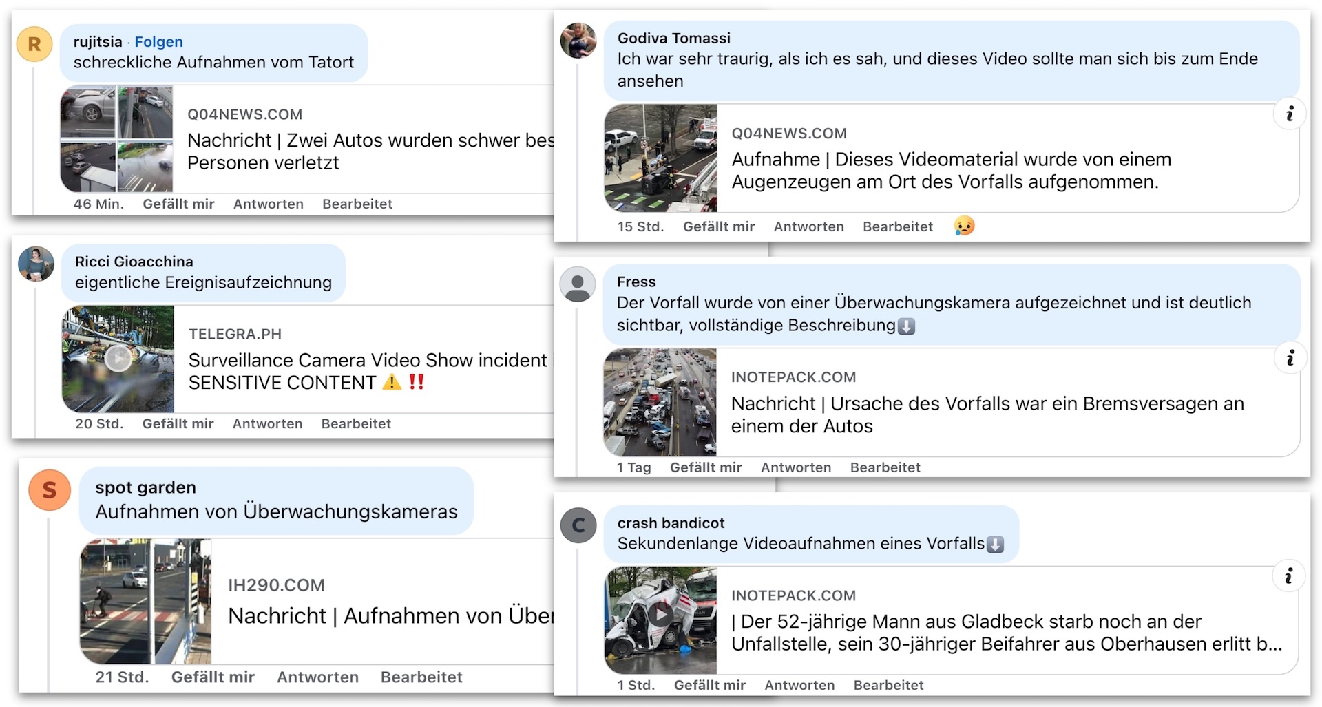 Was ist daran neu? In der aktuellen Spam-Welle gelingt es Angreifern, diese Link-Vorschau zu erzeugen – ohne, dass der eigentliche Link im Kommentartext erscheint. Offenbar nutzen sie dabei Lücken in der Facebook Graph API zur Erstellung von Kommentaren. Diese Art von Kommentaren scheint nur von Facebook-Seiten (nicht von privaten Profilen) abgesendet werden zu können. Die Inhalte reichen von vermeintlichen Unfallvideos bis hin zu Aufnahmen von Überwachungskameras – Inhalte, die auf menschliche Instinkte abzielen und hohe Klickraten versprechen.
